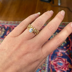 This stunning little ring features a very cool bi-color tanzanite center stone and 2 little round accent diamonds. The tanzanite has a greenish golden hue in the center and lavender tones at either end, creating a lovely shift in tone across the gem. The ring has been accentuated with a pretty open gallery and has 2 small diamond accents to set off the design. Created in a size 6 but can be adjusted as needed.
