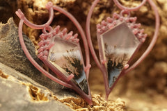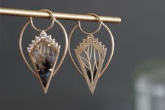 A one-of-a-kind pair of 14K yellow gold and Dendritic agate drop earrings. These earrings each feature a kite shape agate center stone in a 4 talon prong setting. The backside of the earring has an open wirework leaf design to accentuate the natural dendrites within the stone. The earrings have shared prong set diamonds set across the top of the kite shape and have locking wire tops. The earrings weigh a total of 6.9 grams