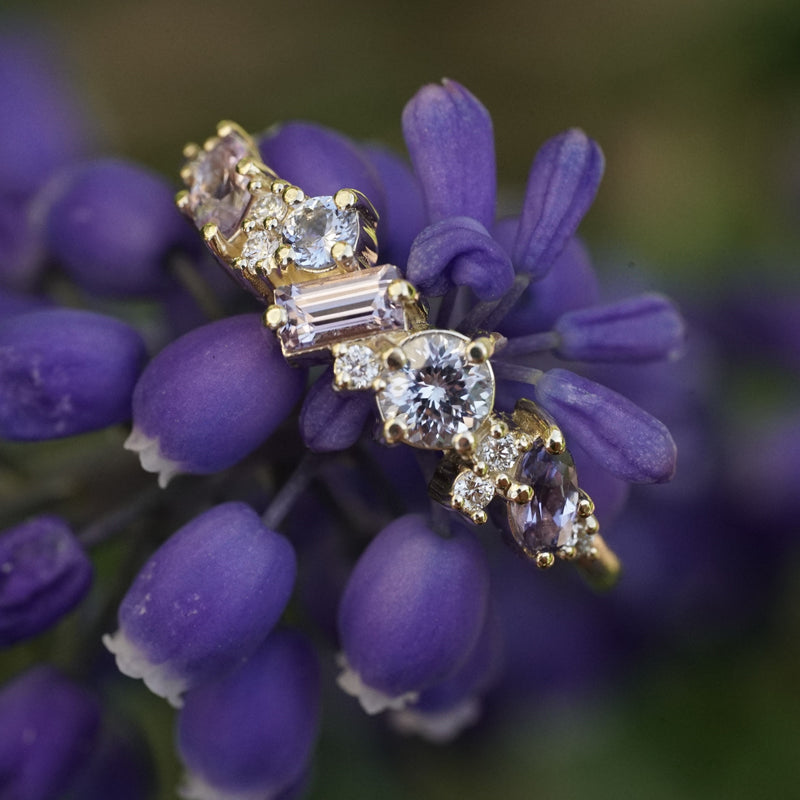 The wisteria ring features sapphires ranging in color from silvery ice blue to medium violet as well as tiny hints of diamond sparkle. Built to stack with existing rings or stand beautifully alone, she's a stunner.
